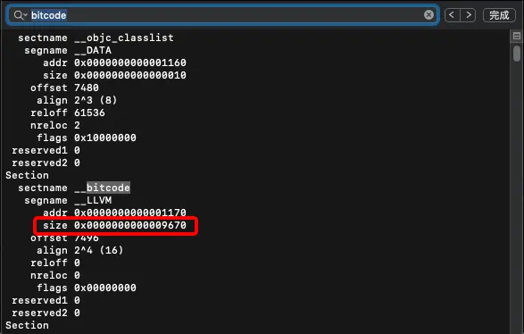 #然后在终端搜索bitcode,如果有结果且size不为0x0000000000000001,则为支持