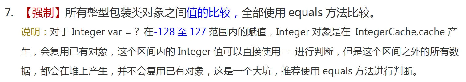 在阅读《阿里巴巴Java开发手册》时,发现有一条关于整型包装类对象之间值比较的规约,具体内容如下: