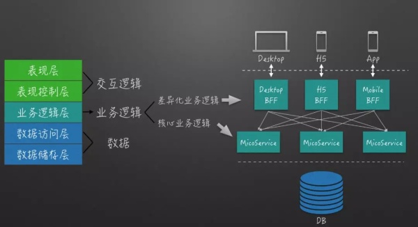 BFF简单来说就是在原有的一体化服务端基础上,针对不同的业务平台分别开发一层独有的、很薄的服务,见下图。
