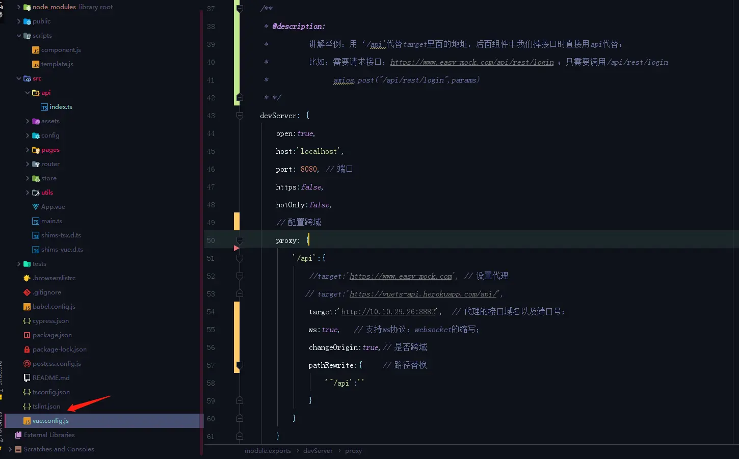 * 讲解举例:用‘/api'代替target里面的地址,后面组件中我们掉接口时直接用api代替;