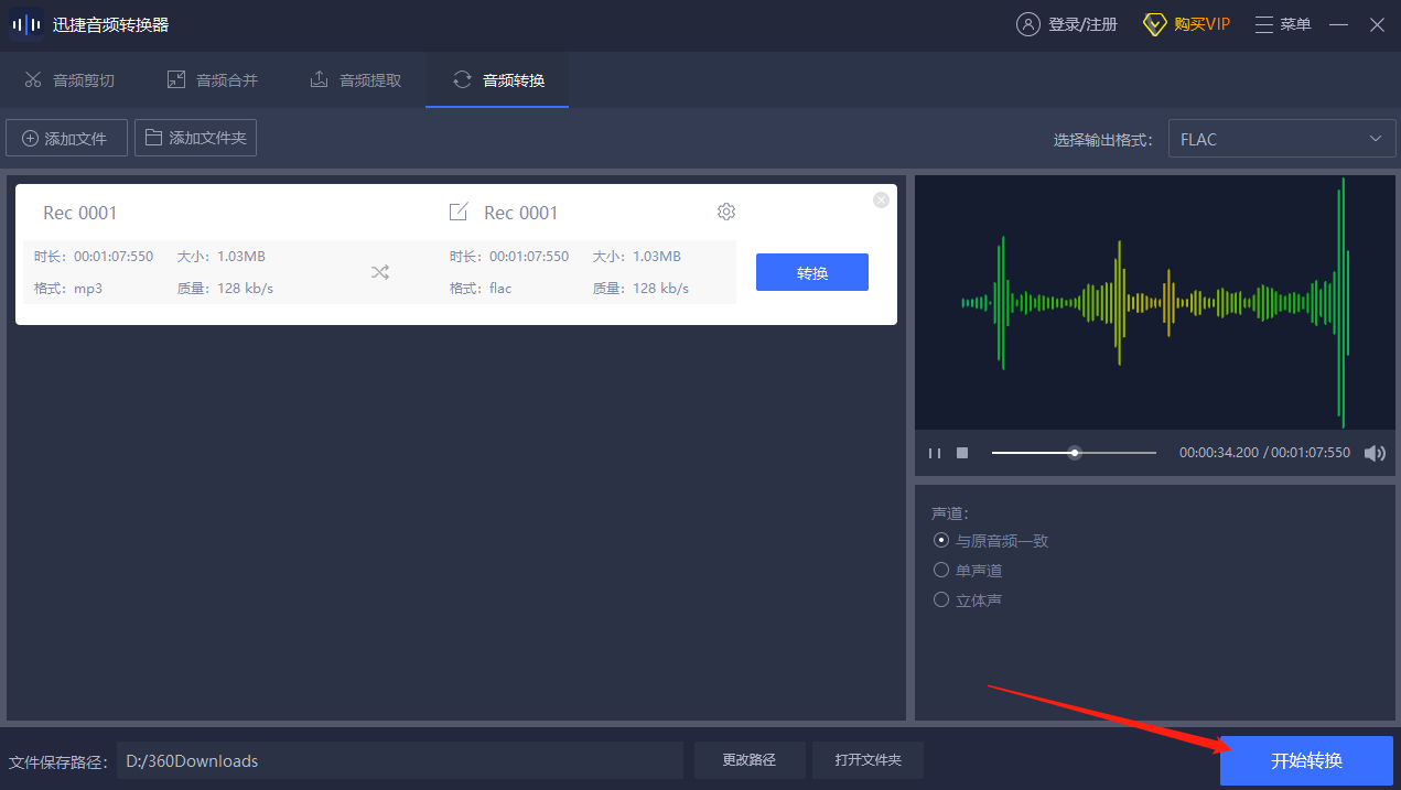 有时候我们在工作中保存音频文件是会需要把自己MP3格式的音频片段变为FLAC格式的音频文件保存下来,改变文件的后缀名虽然可以,但更多时候是不行的,这时我们在电脑中要把MP3怎么转换FLAC格式保存下来?这时我们只需要在自己的电脑上安装上一款专业的音频转换器就可以轻松的解决这个问题。迅捷音频转换器只需要简简单单的几步操作就可以完成音频文件从MP3到FLAC格式的转换。小编这就来为小伙伴们介绍一下这款软件的操作步骤。