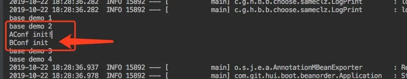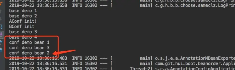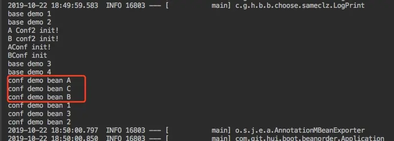 因为注解适用于外部依赖包中的自动配置类的顺序,所以上面三个配置类中,正确的话 AdditionOrderConf2 在 AdditionOrderConf1 之前;而 OrderConf 并不会收到注解的影响,默认环境下,内部定义的配置类会优于外部依赖,从下面的输出也可以佐证我们说明(当然为了验证确实如次,还应该调整下两个外部工程配置类的顺序,并观察下加载顺序是否随之改变,我们这里省略掉了)