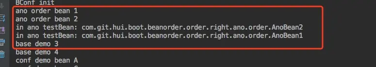 从上面的实际测试输出可以看出,@Order 注解在上面的方式中也不生效,如果有兴趣的同学可以试一下,将上面配置类中的两个方法的顺序颠倒一下,会发现BaseDemo4先加载
