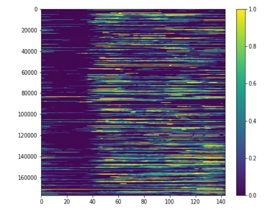 上图代表了一天中一个区域内16万司机的出车时长分布,横轴是一天24小时的144个10分钟,颜色表示该时段经过标准化的出车时长,颜色越鲜艳代表出车时长越长。也许你也发现了,上图光谱比较杂乱,我们很难看出司机出车的规律。