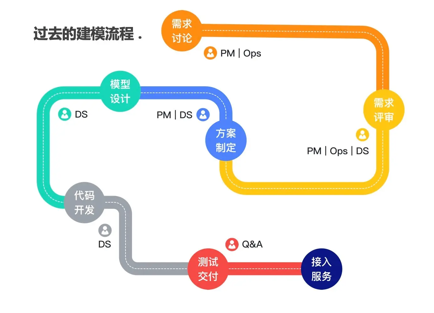 传统建模流程中,通常由业务专家(分析师、运营专家、产品专家等)提出具体需求,通过产品、数据科学、算法、开发、测试等多个角色配合完成具体建模任务。很多情况下,由于大家的专业背景不同,如业务专家不懂AI的原理细节、算法工程师也很难理解业务逻辑的巧妙之处,就会导致沟通成本过高。而即使是基于上述条件完成的模型,往往也不能抽象成应用更广泛的通用模型。
