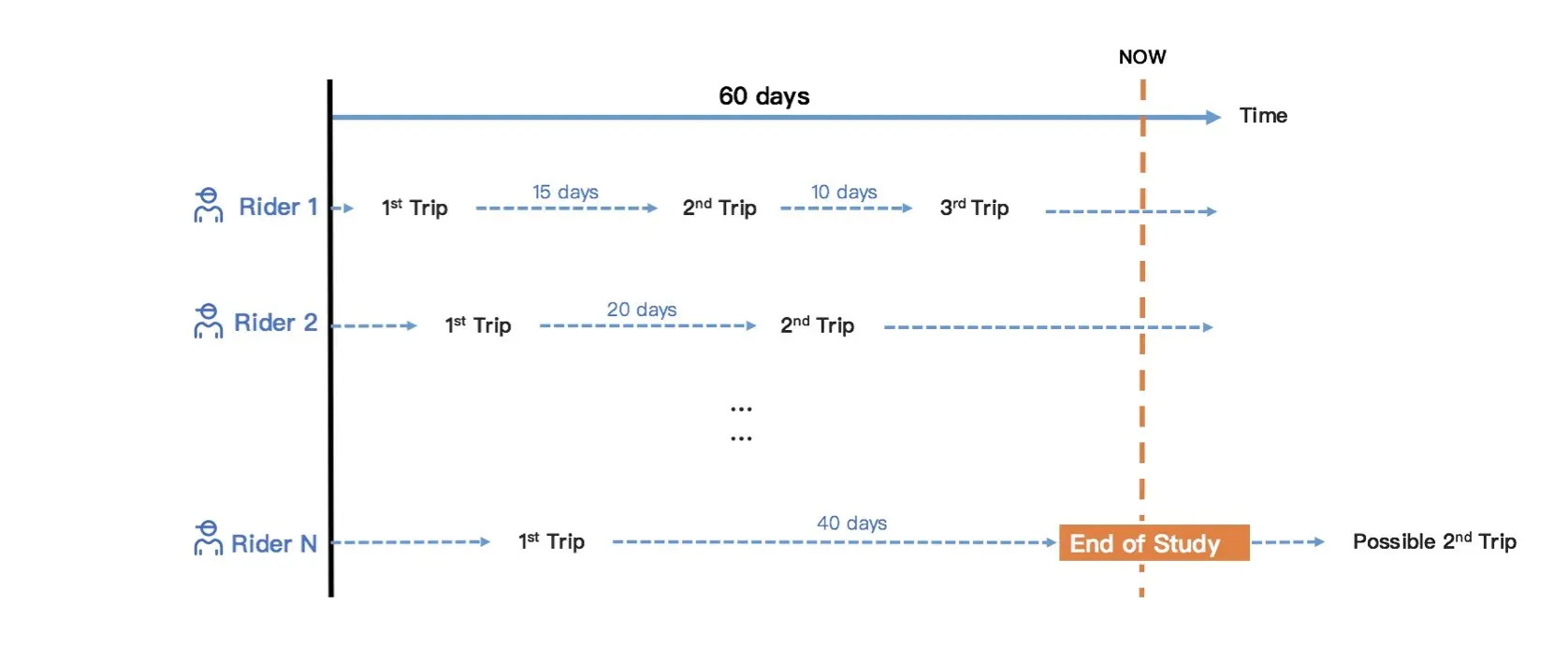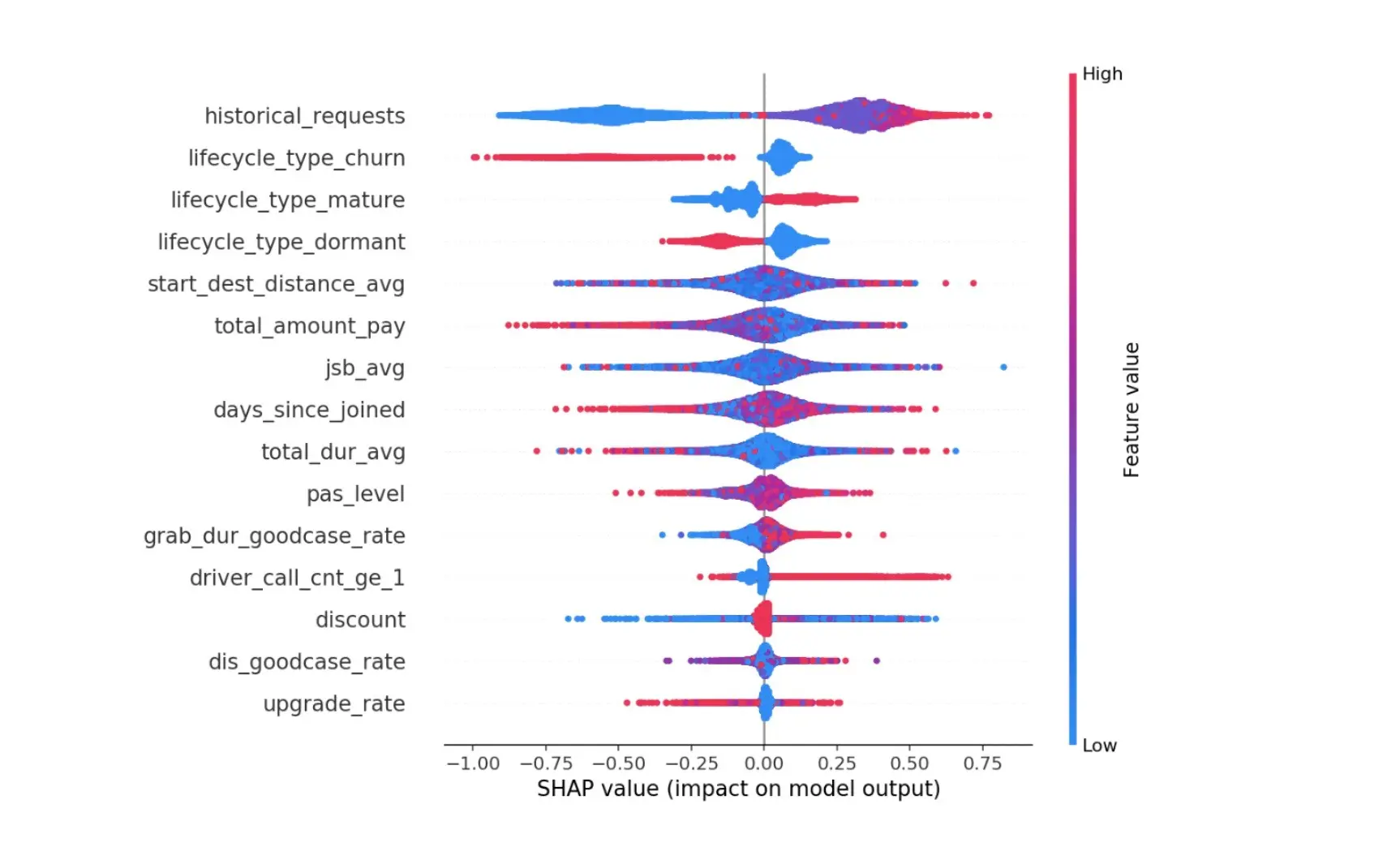 在这个案例中,我们需要确定用户当前处在生命周期的阶段,包括注册天数、等级、行为分等等;从用户对于出行需求上,我们需要知道这个用户历史上打车时所接受的预估里程以及平台累积里程;此外,用户的乘车体验也是我们必须要了解的,包括用户需求次数、接驾距离、应答时长、是否有排队等等。由于这些数据量纲和业务含义的差异化,导致运营同学很难通过简单的数据汇总和前后比分析去决定哪个因素在哪些业务场景下更能影响用户的发单和留存,因此我们必须借助模型的方式对这些信息进行抽象后再将信息的重要程度排序后显现出来。