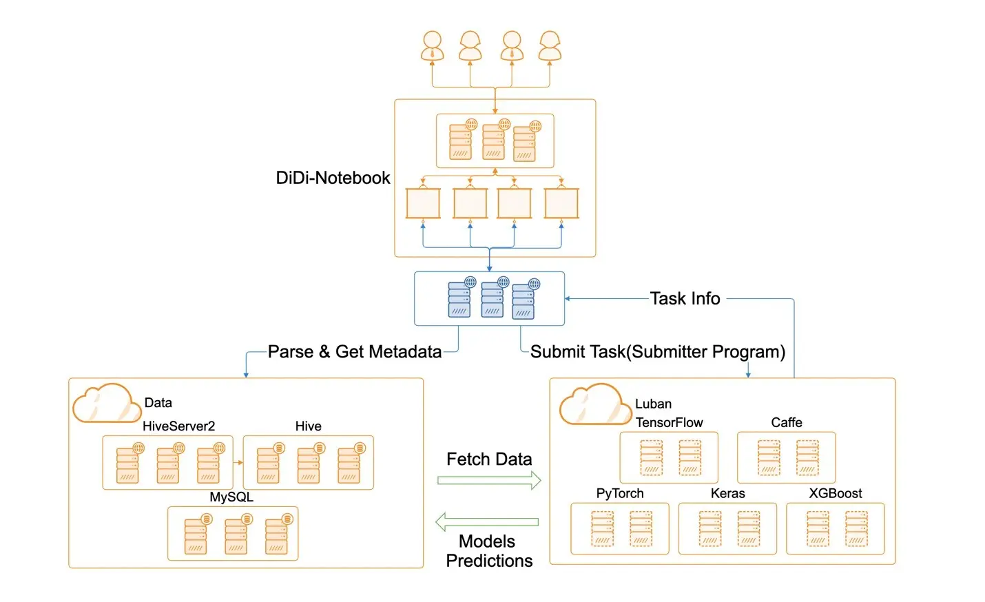 滴滴的大数据平台基于Hive进行打造,SQLFlow主要与Hive集群进行对接。图上蓝色的部分就是SQLFlow服务器,围绕服务器有三个部分,第一部分在上面是滴滴的Notebook,所有的数据分析师和运营专家都在Notebook上操作和编写SQL代码,然后通过SQLFlow服务器连接数据服务器。