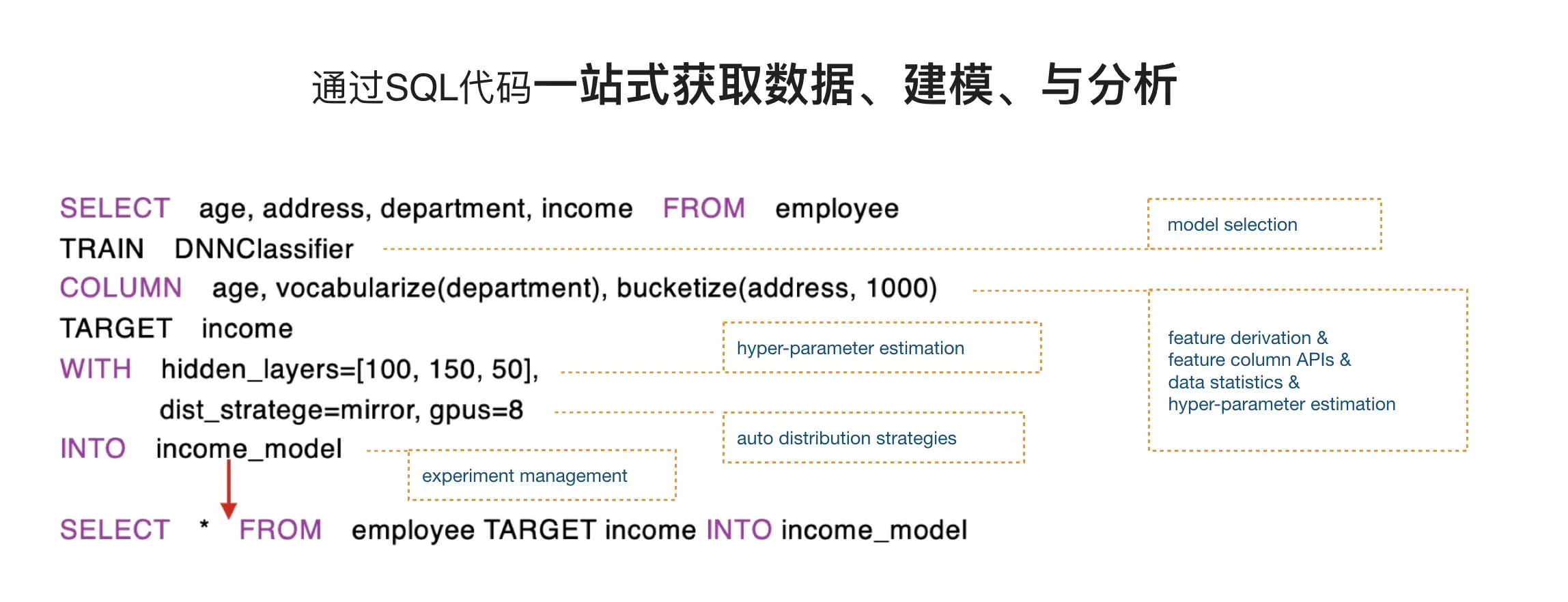 用SQLFlow刚好可以满足这一需求。分析师只需要把待分类的用户数据告诉SQLFlow,就可以去做一个很有效的分类选择器,中间特征的筛选以及特征的组合都可以通过bucketize或者vocabularize做一个处理,最后把训练得到的模型输出到一个叫做income_model的数据集里面。上图的一些方框所表示的代码甚至进一步简化,只用最后一行的代码就可以完成整个模型的训练过程。这样一来,对分析师来讲几乎不存在学习曲线。