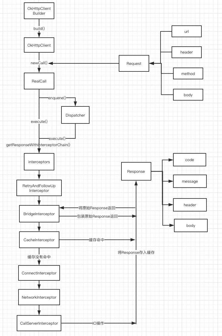 整体来说,是OkHttpClient通过newCall方法,进而触发RealCall的execute(同步)、enquene(异步)方法,经过一系列的interceptors(拦截器),最后经过IO操作发起请求得到Response(响应数据)。