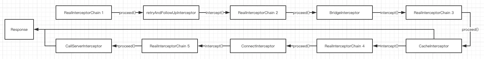 getResponseWithInterceptorChain方法中的往List中加了很多拦截器,最后通过构造了RealInterceptorChain对象,并执行它的proceed方法返回一个Response对象。该方法的工作流程如下图所示。