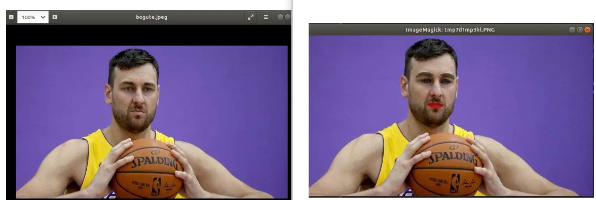 根据以上代码做了,我用实力不行,打球又脏的 "大嘴" 博格特来做演示! 左边是原图,右边是加了美妆后的效果