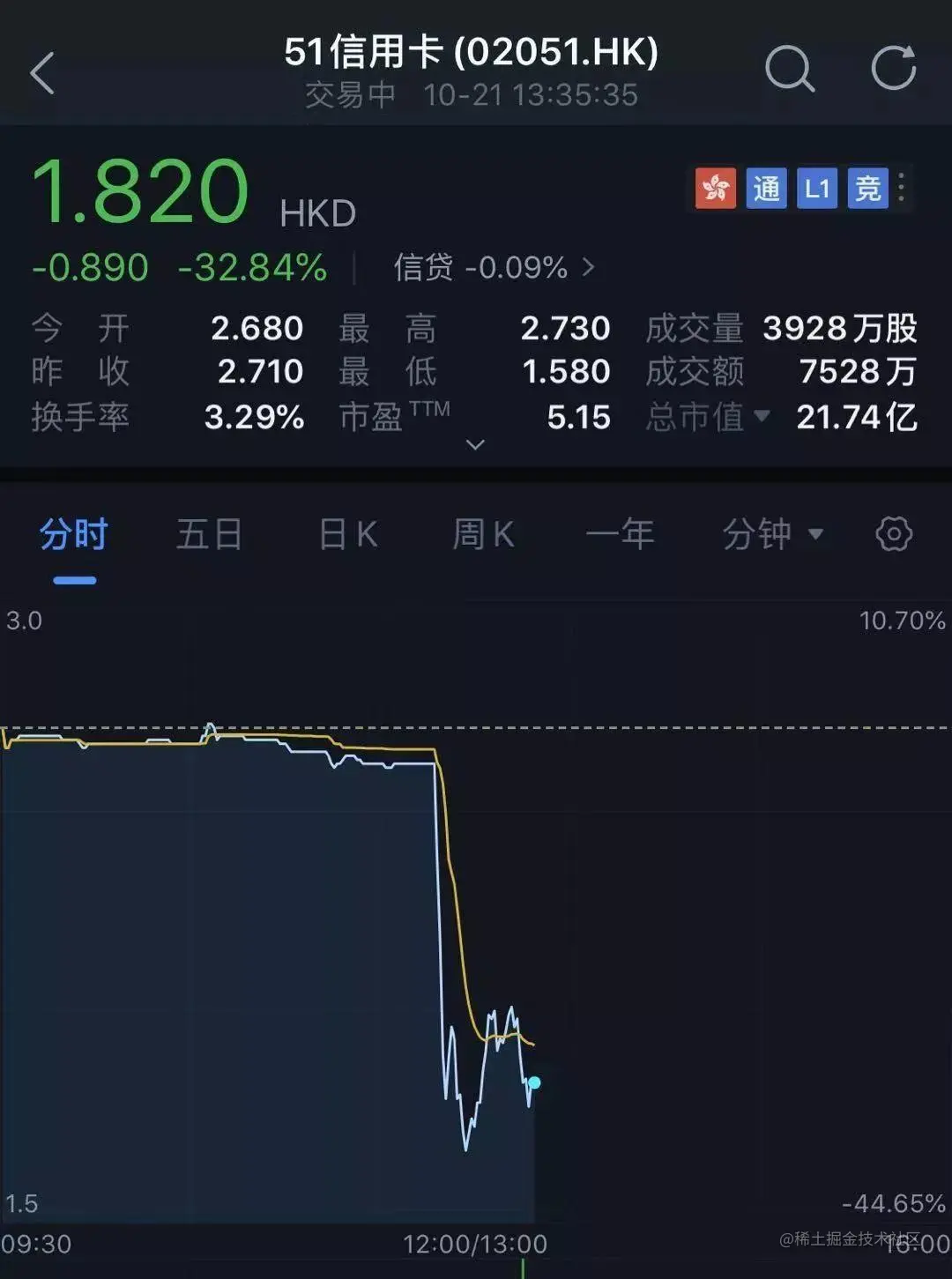 受此消息影响,51信用卡紧急停牌,停牌前报1.78港元,跌幅高达34.32%,成交8871万港元,最新总市值21.26亿港元。该股盘中股价最低至1.58港元,一度跌幅超过40%,为上市以来最低价。