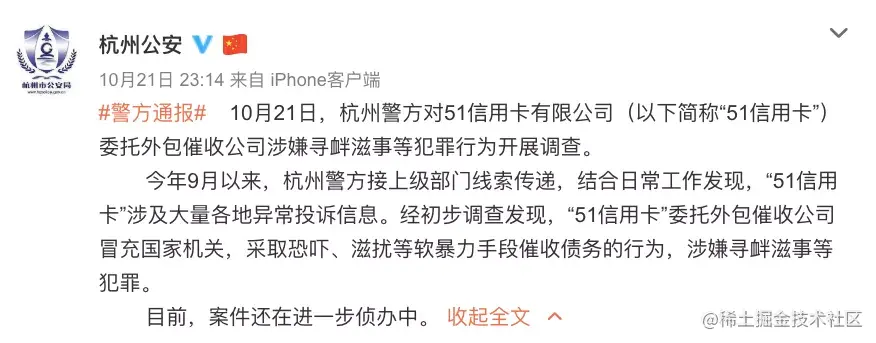 说了这么多,难道51信用卡也是因为爬虫被查?并不是,后面杭州警方官方通告出来了
