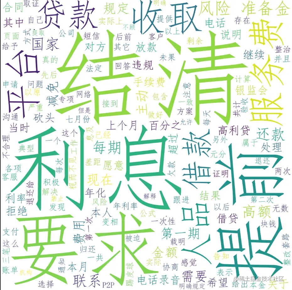 有了数据就能做一些事情了,这里只是简单的做了个词云图,能直观看出被投诉最多的,高利息,砍头息,高利贷等