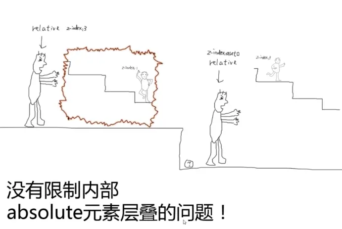 position: relative可以提高层级,并且其他提高层级效果没有relative高 - 如果relative所在元素设置z-index:auto 则不能限制内部absolute元素层叠的问题