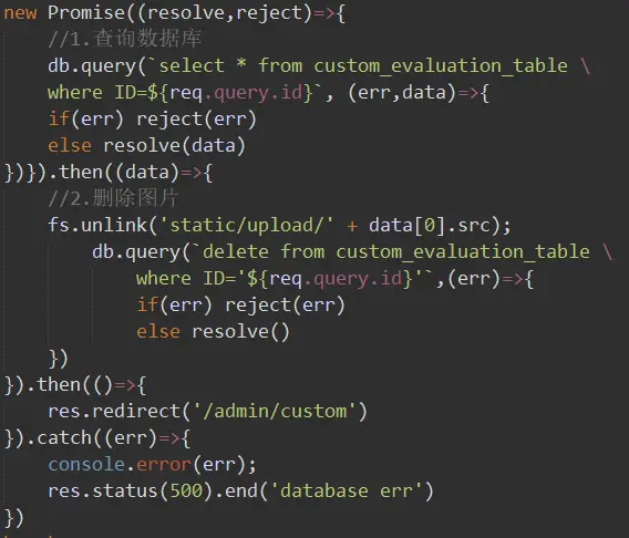 这只是简单的数据库查询操作,当操作多时就会回调中嵌着回调,所谓的回调地狱. 使用Promise呢?