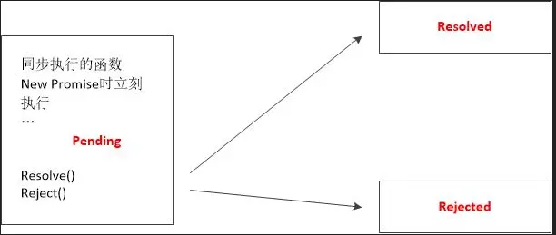 Promise一旦新建就立刻执行, 此时的状态是Pending(进行中),它接受两个参数分别是resolve和reject.它们是两个函数.