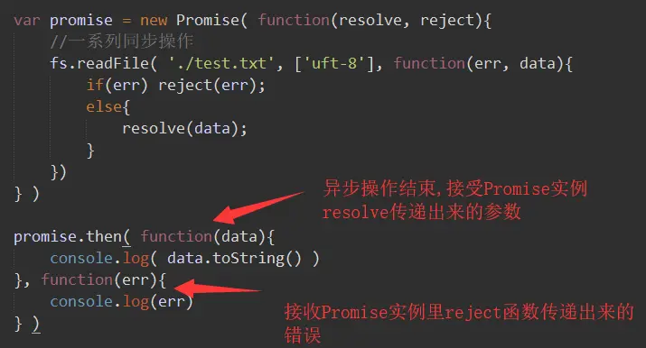 3.使用resolve函数将异步操作的结果传递出去, reject函数传递异步操作的错误