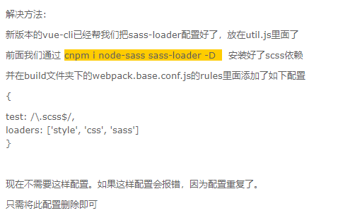 但是在我这还是不行。 最后我降低了sass—loader的版本。 直接npm安装的是8.0.0的版本,最后我装了7.3.1版本 #npm install sass-loader@7.3.1 --save-dev 然后在装一次sass #npm install --save-dev node-sass 因为sass依赖loader 最后解决该问题!!!