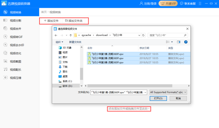 1、要转换qsv格式需要把下载好的qsv格式添加到迅捷视频转换器中,添加的时候可以点击“添加文件”或“添加文件夹”按钮,也可以用拖拽的方式直接把qsv视频拖拽到软件中。