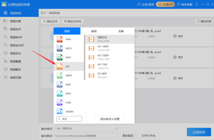 2、添加好视频后设置视频输出到电脑的“输出格式”,输出格式又分为视频格式和视频分辨率。因为要把qsv格式转换成avi格式,所以注意把输出的视频格式设置为‘avi’格式。