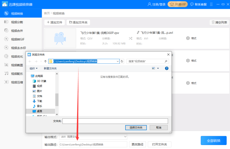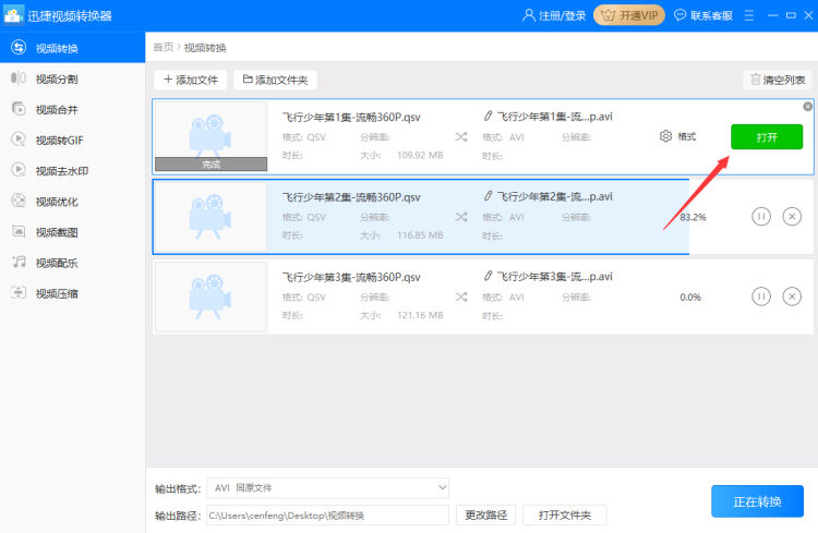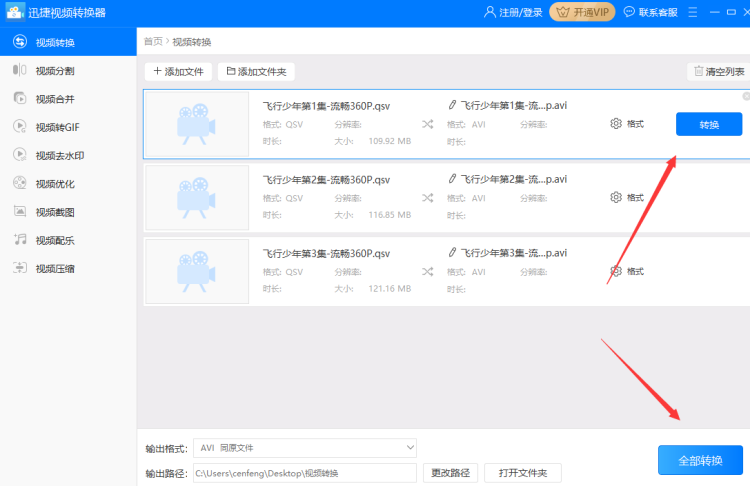 4、设置好输出路径后依次点击“转换”按钮单独转换需要转换视频格式,也可以直接点击软件右下角的“全部转换”按钮统一把qsv格式转换成avi格式。