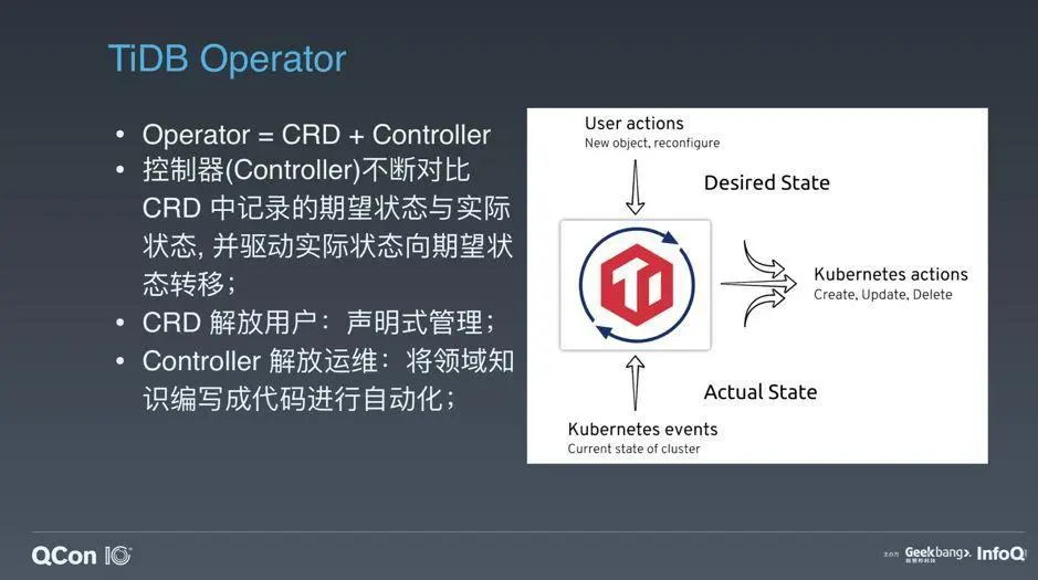 接下来的问题是控制器如何协调基础设施层的状态与应用层的状态。举个例子,在滚动升级 TiKV 时,每次重启 TiKV 实例前,都要先驱逐该实例上的所有 Region Leader;而在缩容 TiKV 时,则要先在 PD 中将待缩容的 TiKV 下线,等待待缩容的 TiKV 实例上的 Region 全部迁移走,PD 认为 TiKV 下线完成时,再真正执行缩容操作调整 Pod 个数。这些都是在编排中协调应用层状态的例子,我们可以怎么做自动化呢?