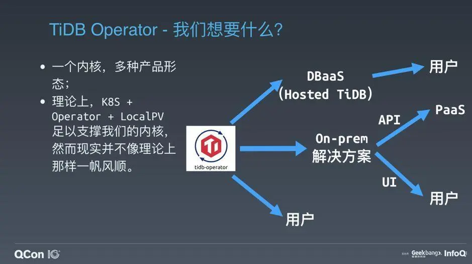 TiDB Operator 的意义在于让 TiDB 能够无缝运行在 Kubernetes 上,而 Kubernetes 又为我们抽象了基础设施。因此,TiDB Operator 也是 TiDB 多种产品形态的内核。对于希望直接使用 TiDB Operator 的用户, TiDB Operator 能做到在既有 Kubernetes 集群或公有云上开箱即用;而对于不希望有太大运维负载,又需求一套完整的分布式数据库解决方案的用户,我们则提供了打包 Kubernetes 的 on-premise 部署解决方案,用户可以直接通过方案中打包的 GUI 操作 TiDB 集群,也能通过 OpenAPI 将集群管理能力接入到自己现有的 PaaS 平台中;另外,对于完全不想运维数据库,只希望购买 SQL 计算与存储能力的用户,我们则基于 TiDB Operator 提供托管的 TiDB 服务,也即 DBaaS(Database as a Service)。