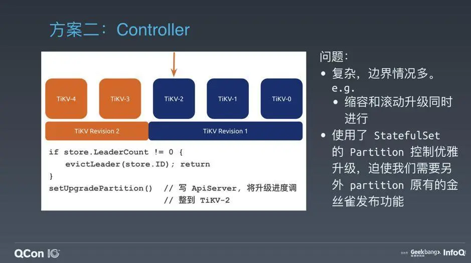 在伪代码中,每次我们因为要将所有 Pod 收敛到新版本而进入这段控制逻辑时,都会先检查下一个要待升级的 TiKV 实例上 leader 是否迁移完毕,直到迁移完毕才会继续往下走,调整 partition 参数,开始升级对应的 TiKV 实例。缩容也是类似的逻辑。但你可能已经意识到,缩容和滚动更新两个操作是有可能同时出现在状态收敛的过程中的,也就是同时修改 replicas 和 image 字段。这时候由于控制器需要区分缩容与滚动更新,诸如此类的边界条件会让控制器越来越复杂。
