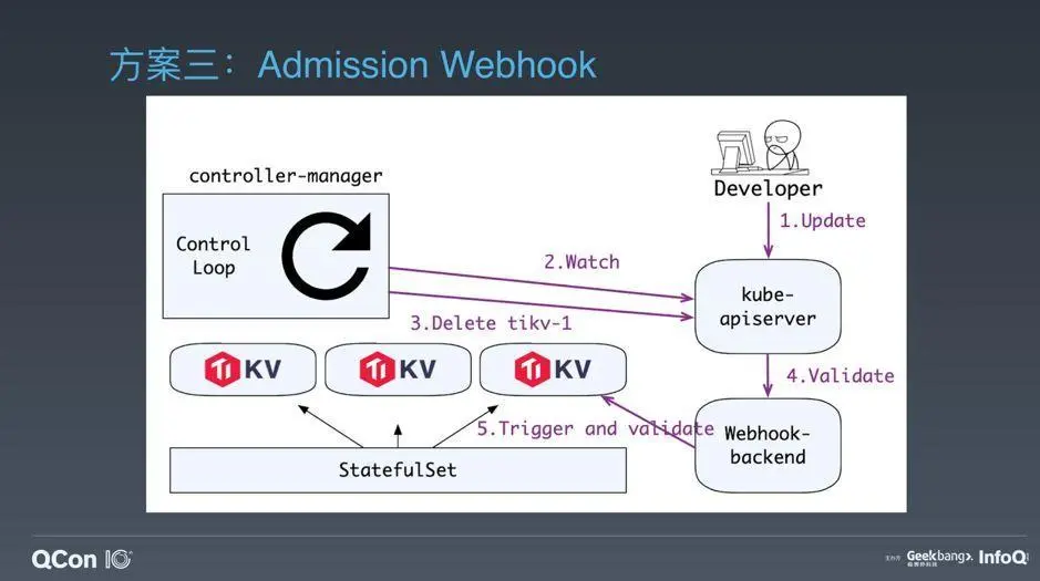 大家也注意到了,上面的例子都和 Pod 下线挂钩,因此一个简单的方案就通过 container lifecycle hook,在 preStop 时执行一个脚本进行协调。这个方案碰到的第一个问题是缺乏全局信息,脚本中无法区分当前是在滚动升级还是缩容。当然,这可以通过在脚本中查询 apiserver 来绕过。更大的问题是 preStop hook 存在 grace period,kubelet 最多等待 .spec.terminationGracePeriodSeconds 这么长的时间,就会强制删除 Pod。对于 TiDB 的场景而言,我们更希望在自动的下线逻辑失败时进行等待并报警,通知运维人员介入,以便于最小化影响,因此基于 container hook 来做是不可接受的。