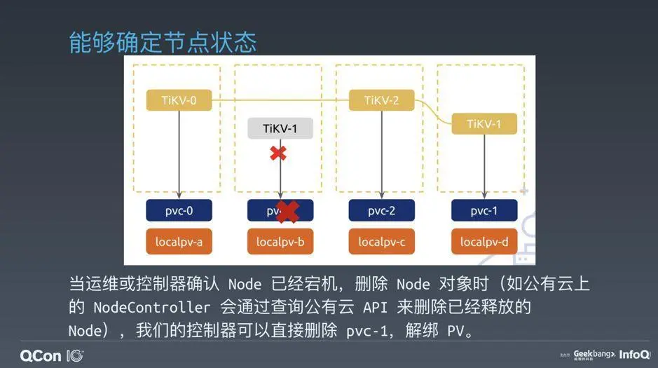 此时,假如我们能够确认 Node 已经宕机并且短期无法恢复,那么就可以删除 Node 对象(比如 NodeController 在公有上会查询公有云的 API 来删除已经释放的 Node)。此时,控制器通过 Node 对象不存在这一事实理解了 Node 已经无法恢复,就可以直接删除 pvc-1 来解绑 PV,并强制删除 TiKV-1,最终让 TiKV-1 调度到其它节点上。当然,我们同时也要做应用层状态的协调,也就是先在 PD 中下线 TiKV-1,再将新的 TiKV-1 作为一个新成员加入集群,此时,PD 就会通知 TiKV-1 创建 Region 副本来补齐集群中的 Region 副本数。