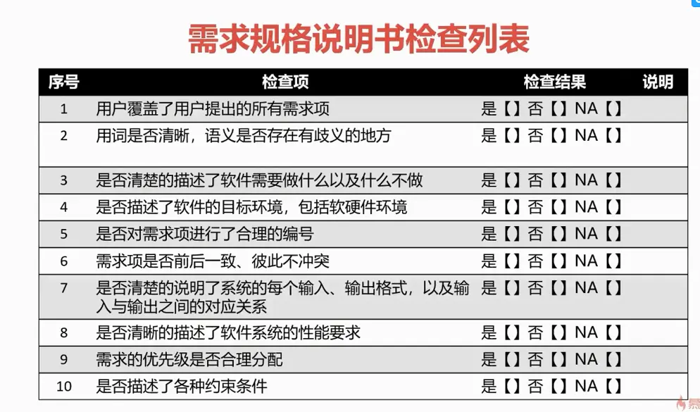 需求测试流程:审查需求文档 需求规格说明书检查列表: