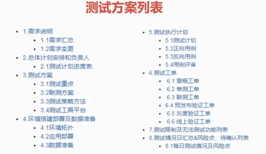 - 测试策略:侧重需求分析,风险评估,定义测试范围,确定测试方法,制定测试启动、停止、完成标准和条件