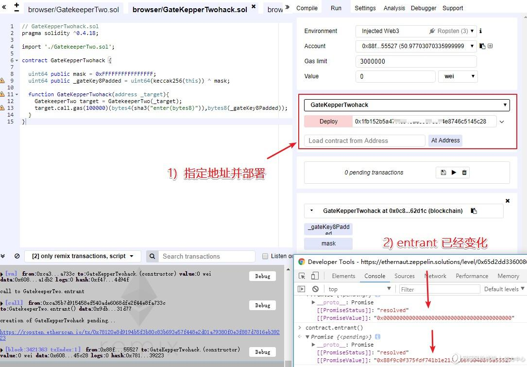 而这里的代码,条件为调用方代码大小为 0 ,但这又与 gateOne 冲突了。经过研究发现,当合约在初始化,还未完全创建时,代码大小是可以为0的。因此,我们需要把攻击合约的调用操作写在 constructor 构造函数中。