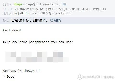 另一方面,我也通过邮件跟 0age 拿到了两个 passphrases 。
