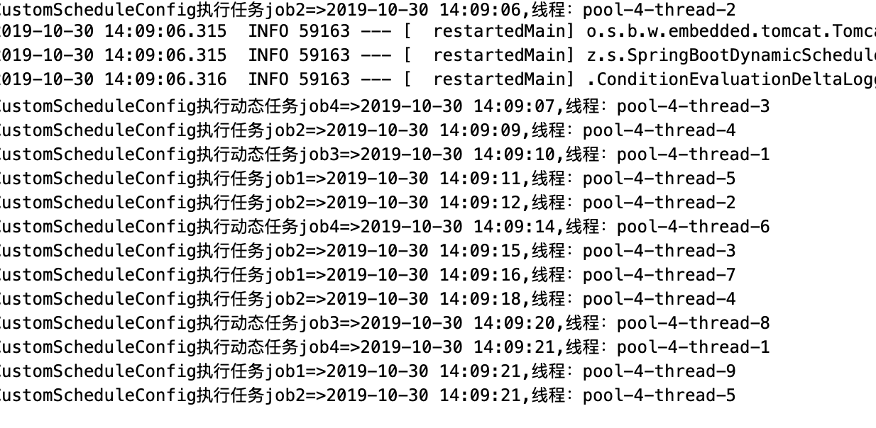 System.out.println("CustomScheduleConfig执行动态任务job4=>" + DateUtil.formatDateTime(new Date()) + ",线程:"