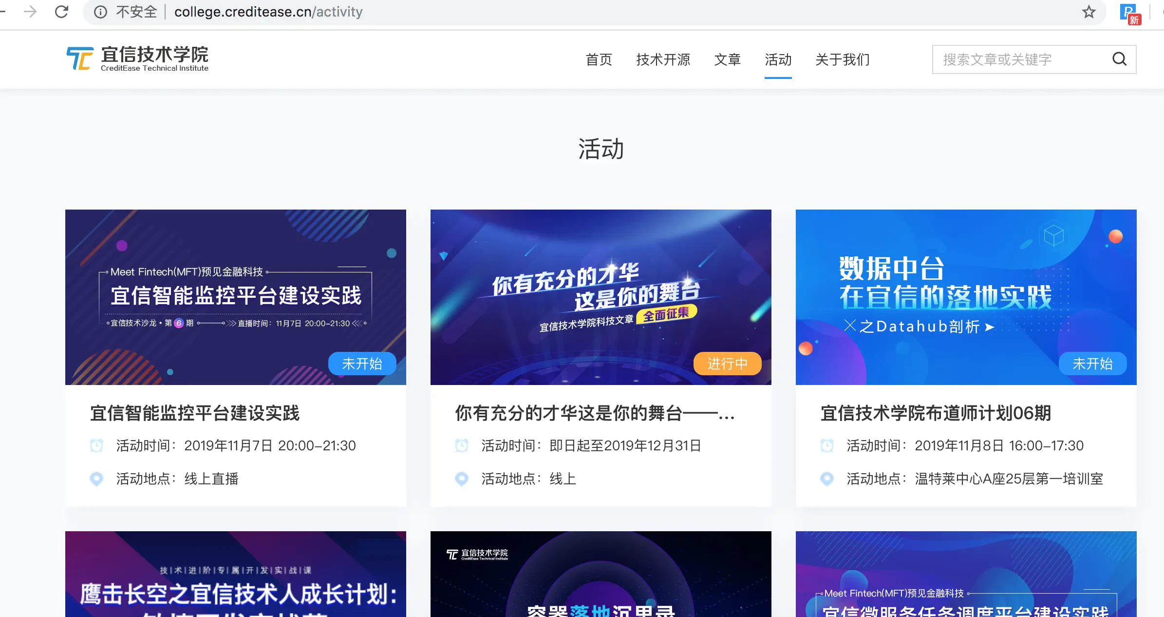 本次官网改版调整了活动版块的展现形式,通过在活动列表页加入活动状态展示及在活动详情页加入活动推荐列表等方式,让用户能够更加直观地了解到近期活动的主题及相关信息,同时优化了活动推荐及详情的展现样式,让信息呈现更加清晰直观。