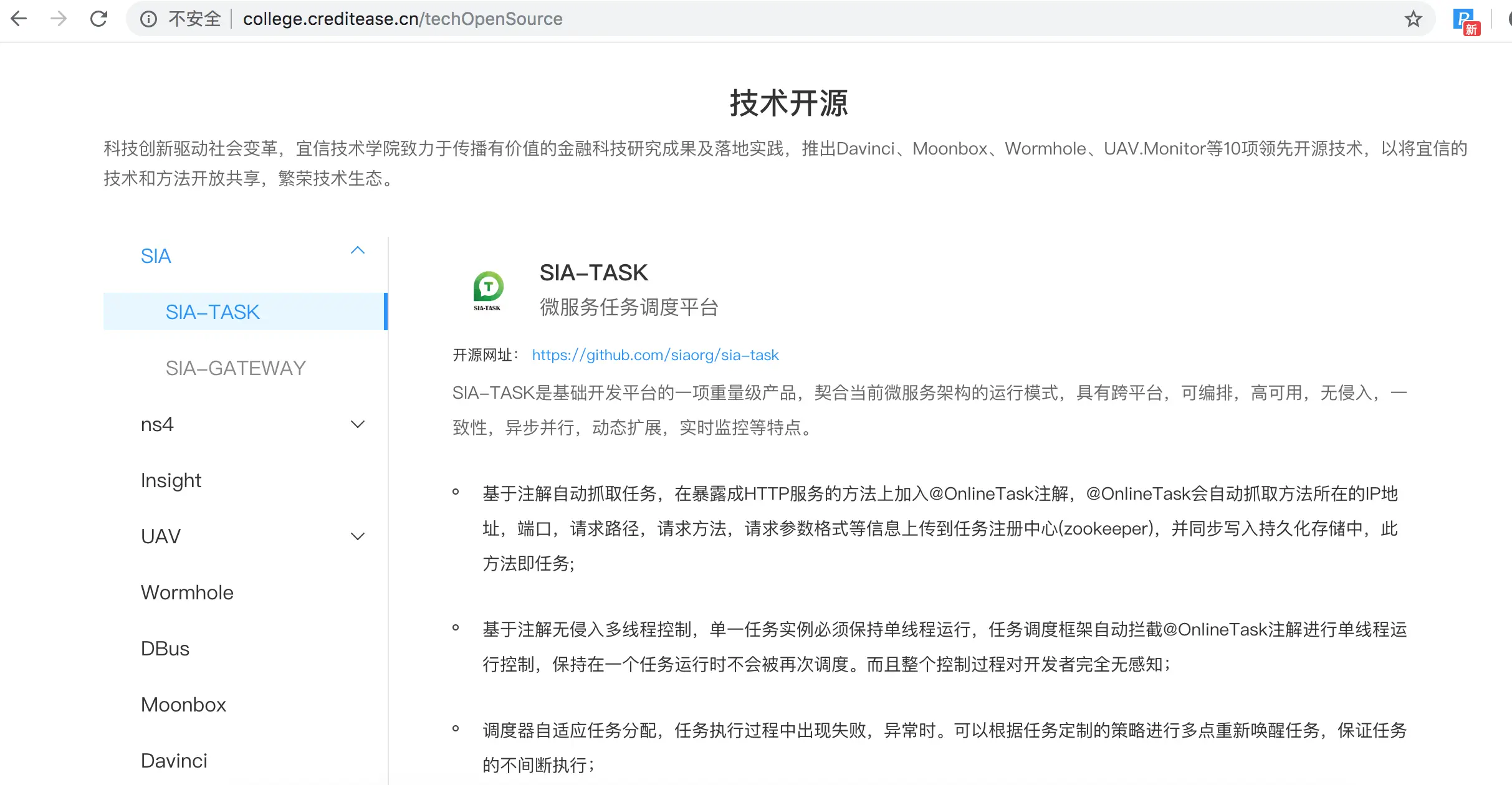 宜信技术学院主导传播多个宜信技术开源成果,并建立开发者生态。到目前为止,我们开源了Davinci、Moonbox、Wormhole、UAV.Monitor、SIA-TASK等多个技术框架,在宜信技术学院官网上对每个技术框架的特性、原理、使用方式都做了详细说明,并实时更新维护。
