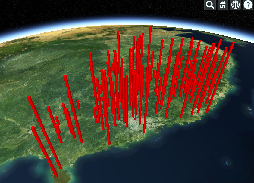对于小数据量和简单的实体,适合这种viewr.entities的方式,比如全国省份人口统计用柱状图展示,只需要知道每个省的一个点坐标和人口数即可;还有加入模型实体,只需准备模型文件和设置放置的点坐标即可。 对于大数据量或复杂的实体(如上图)则适合使用viewer.dataSources方式绘制。