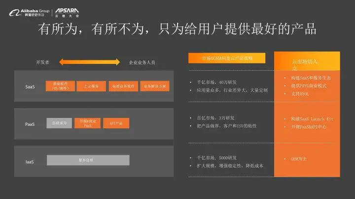 大家可以看到整个左侧是分为IaaS、Pass、SaaS三大块市场,灰色的部分表示阿里云在市场选择的策略。