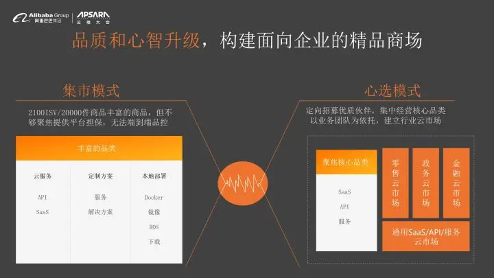 今年我们升级了业务策略,在保持集市模式特点的同时,聚焦一些核心品类,超预期给企业客户提供更好的品质和服务。所以我们今天推出心选品牌,让客户买软件,用服务,放心选。心选模式刚刚启动的时候,我们会以定向的招募为主,我们首先会聚焦企业通用性的需求,构建通用SaaS产品矩阵;同时围绕阿里云的行业主赛道,聚焦政府和新零售,这也是我们今天即将发布的新零售SaaS以及政务SaaS。