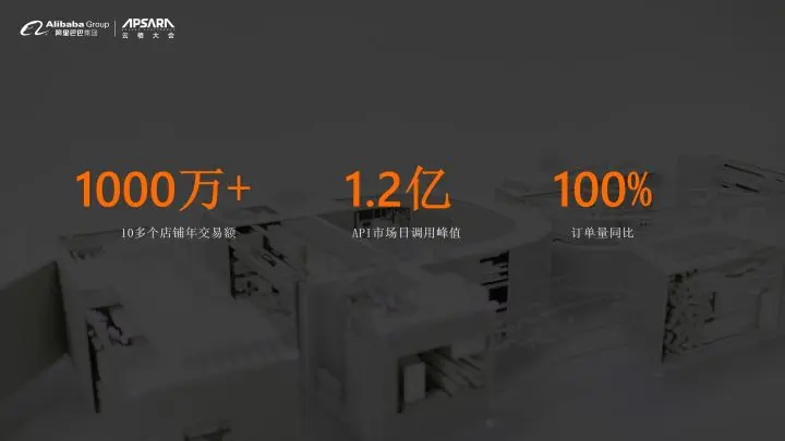 那我们今年差不多已经有十多个店铺,它的年交易是过千万了。API市场里面的,日调用峰值是过了1.2个亿。最后就是平台里面我们整体的订单,年化还是百分百增长的。这一系列整个订单的背后,源于我们有一个体系化的运营。