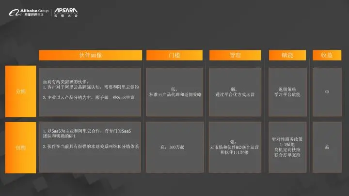 第二种模式,我们希望合作伙伴能够有专门去做SaaS业务的团队,它的核心的职责、核心的KPI,以及它核心的业务方向,就是SaaS。那这个事情我们在做的时候,一方面是对于它本身团队有要求;另一方面,我们对于它的业绩也有一定的要求。