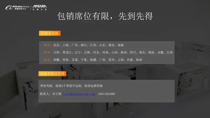 我们启动整个包销计划,整个国内的省市会分成三个级别,按照GDP水平、信息化的水平、SaaS的渗透率几个纬度。所以如果说,你们对于一些特定的省感兴趣的话,你们可以成为这个省的总经销商,对应的一二三级省,就意味我们的业绩要求是不一样的。