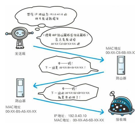使用ARP(Address Resolution Protocol)协议凭借MAC地址进行通信:IP间的通信依赖MAC地址,网络通信过程种,通过多台计算机或网络设 备进行中转时,会利用下一站中转设备的MAC地址来搜索下一个中转目标,这是就要利用ARP协议来解析地址,根据通信方的IP地址就可以反查出 对应的MAC地址
