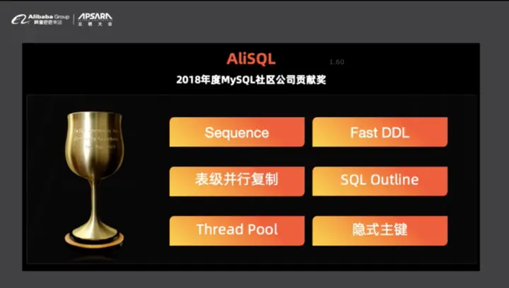 对于阿里而言,AliSQL获得了2018年MySQL的社区公司贡献奖,这是因为AliSQL做了大量优化,比如实现了Sequence、表级并行复制以及隐式主键等。而做这些优化的驱动力是阿里内部的业务需求,并且对于技术的优化后续就会贡献回开源社区。