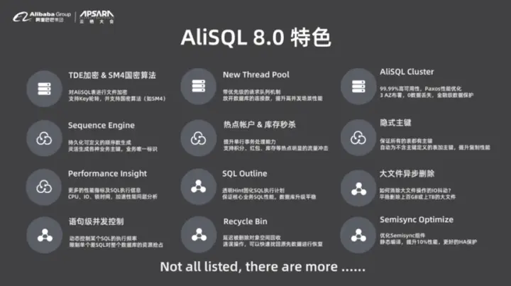 基于这个思路,阿里云在一年半之前就将主要精力投入到MySQL 8.0上面,这是因为MySQL 8.0更能够满足以上目标。MySQL 8.0具有Automic DDL、Instant Add Column、Window Function和Temp Engine的能力。而AliSQL在MySQL的基础之上还做了更多的优化,比如支持了TDE加密和SM4国密算法,并且重新设计了线程池,AliSQL Cluster支持三节点并能做到RTO为0等。