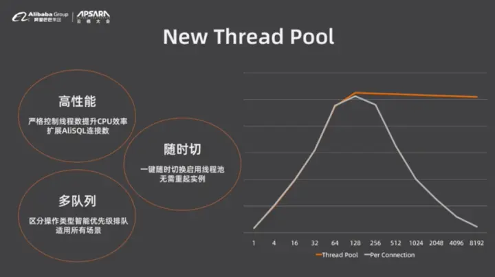 MySQL官方版本也有线程池,而AliSQL线程池的区别在于连接数可以达到2万,并且能保持非常平稳的输出。首先,AliSQL严格控制了线程数来提升了CPU效率,做到了高性能。其次,AliSQL可以一键随时切换启用线程池,而无需重启实例。最后,AliSQL能够区分操作类型并实现智能优先级排队,并适用于所有业务场景。总之,AliSQL的线程池是完全重新实现的,并且性能也会超出期望。