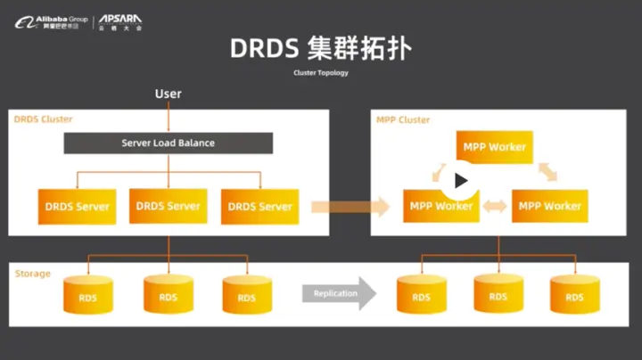 下图是典型的DRDS部署拓扑,图左侧分为两层,Server层包含多个无状态的DRDS节点,DRDS节点向Load Balancer汇报心跳,如果出现宕机,Load Balancer就会将流量迁移到其他节点上,保证集群高可用。存储层可能使用RDS、POLARDB甚至列式存储。总体来说,查询会在Server层被转化成执行计划,在存储层具体执行并返回给用户。图右侧是DRDS的分析型只读实例,里面包含多个MPP Worker。对于复杂SQL,单台机器可能无法完成计算,此时就会将SQL的执行计划发往MPP集群来计算,并且不会对主库产生影响。