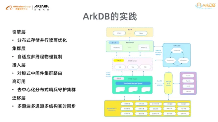 虽然MySQL官方近几年很努力,但是依旧存在一些不足之处,因此ArkDB也希望能够基于MySQL做出一些贡献。ArkDB在MySQL的基础上做了大量并行化实践。在引擎层,ArkDB实现了计算和存储分离,通过分布式存储实现了并行读写优化。在集群层,ArkDB实现了自适应多线程物理复制,极大地提升了数据复制效率。在接入层,ArkDB实现了对称式中间件集群路由,是接入层成为无状态的,能够承担大规模的访问应用。在高可用方面,ArkDB实现了去中心化分布式哨兵守护集群。在迁移层,ArkDB实现了多源端多通道多结构实时同步,可以实现精确到行级的运行。